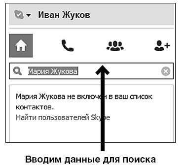2. Откроется поле, в которое вы можете ввести данные о человеке (на выбор) – его логин в программе Skype (если знаете), адрес его электронной почты (если он вам известен), его имя и фамилию.