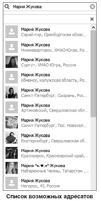 3. В колонке слева откроются результаты поиска. Если вы ввели имя и фамилию, то в списке может быть несколько адресатов, для того чтобы выбрать нужного, смотрите на фото (если оно есть), на город, в котором зарегистрирован пользователь.