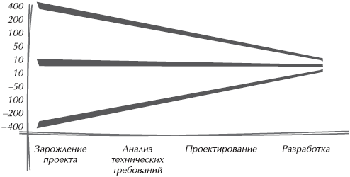 Барри Боэм (Barry Boehm) в 1988 году в своем эссе на тему разработки программных продуктов[11] писал, что ошибки тем масштабнее, чем раньше при реализации проекта делались расчеты для календарного плана (рис. 2.3). Если все расчеты делались на ранней стадии, отклонения могут составлять до 400 % в обоих направлениях (подозреваю, что ошибки всегда работают против нас, стремясь отнять больше времени, чем мы ожидаем, хотя Боэм в своих данных этого не показал). В период проектирования по мере конкретизации решений расхождение сокращается, но остается еще весьма значительным. И только когда проект достигает стадии реализации, диапазон расчетов календарного плана приобретает разумные очертания, но даже тогда остается 20-процентный разброс вероятности планирования.