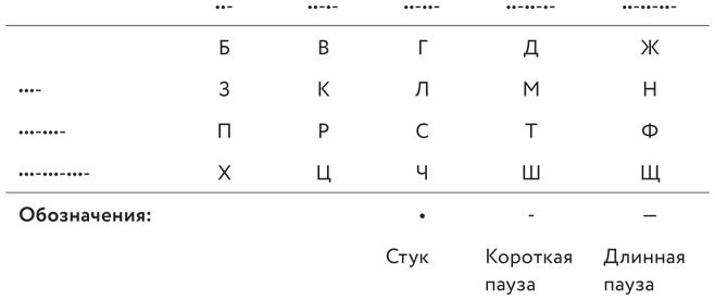 Было и еще одно слуховое преимущество перестукивания по этой азбуке: «…все согласные буквы, доходившие до вашего слуха в одном и том же ‹…› виде двойных учащенных звуков, не далее шестой цифры – но только предшествуемые однократным или двукратным стуком, не напрягали вашего внимания считать число ударов. Вы без всякого счета только следили за двойными ударами, предшествуемыми тройным ускоренным стуком. Так, например: в утреннем нашем приветствии: “Здорово” я стучал тройку скоро и потом двойку, как бьют на корабле склянки (•••– // ••-), и это будет означать букву “з”. Потом двойку, двойку и один раз (••-••-•-), это буква “д”. Потом четыре раздельных звука (•-•-•-•-), то есть букву “о”. Потом на конце, расслышав явственно “в” и “о”, пропустив средний слог, мне нетрудно будет догадаться, что это слово “зд-оро-во”». Подметим еще одно полезное свойство этой азбуки: если вы случайно сделали ошибку при простукивании буквы, то в конечном счете ваш собрат по заключению все равно сможет угадать это слово.