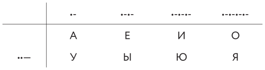 А теперь наше задание. М. А. Бестужев однажды свою азбуку «начертил обожженным прутиком из веника ‹…› на одной из страниц примечаний к девятому тому “Российской истории” Карамзина. Как любопытно было бы узнать, что мог заключить собственник этой книги, когда она была ему возвращена, увидев эти непонятные начертания?..» Представьте себя на месте узника Алексеевского равелина, к которому попала эта несколько подпорченная мышами книга с шифром (но, увы, без гласных букв) и вы услышали следующий тихий стук вечером: