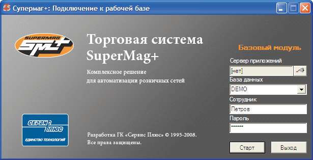 Для реализации указанных выше задач могут применяться несколько интегрированных продуктов, разработанных компанией «Сервис Плюс». В качестве основной управляющей системы применяется торговая система «Супермаг Плюс», в ней работают менеджеры и аналитики центрального и региональных офисов, а также операторы магазинов и складов. Для оформления продаж на кассовых узлах используется фронт-офисная система «Супермаг УКМ», которая получает необходимые данные для формирования чеков из торговой системы и передает в нее данные об осуществленных через кассы продажах. В качестве мобильных АРМ для осуществления приемки товаров, контроля цен, проведения инвентаризаций используется программное обеспечение «СуперКит Мобайл», установленное на мобильных терминалах сбора данных.