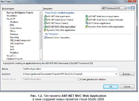 После установки MVC Framework в списке доступных проектов в Visual Studio появится пункт ASP.NET MVC Web Application. Этот тип проекта доступен только в случае, если выбрана версия .NET Framework 3.5 (рис. 1.2).
