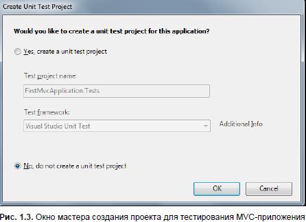 Во время создания проекта, который мы в дальнейшем будем называть MVC-приложением, Visual Studio предложит сразу же создать оснастку для тестирования веб-приложения (рис. 1.3). Мы не будем затрагивать тему тестирования MVC-приложений до соответствующей главы, поэтому при создании первого приложения откажемся от создания проекта тестирования.