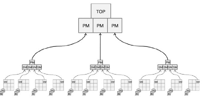Следующим уровнем масштабирования является Scrum of Scrum of Scrum. Для осуществления этого проводится соответствующее мероприятие, на которое собираются менеджеры программ и топ-менеджер (обычно технический директор подразделения).