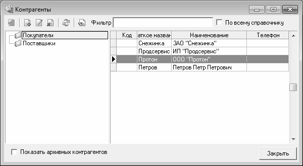 На рисунке видно, что окно справочника разделено на две части. Дело в том, что для удобства работы в программе реализована возможность группировки контрагентов по тем либо иным признакам (например, поставщиков можно объединить в группу Поставщики, покупателей – в группу Покупатели, и т. п.). Поэтому в левой части окна отображается список групп контрагентов, а в правой части показано содержимое текущей группы. Например, на рис. 5.7 в справочнике показаны контрагенты, включенные в группу Покупатели.