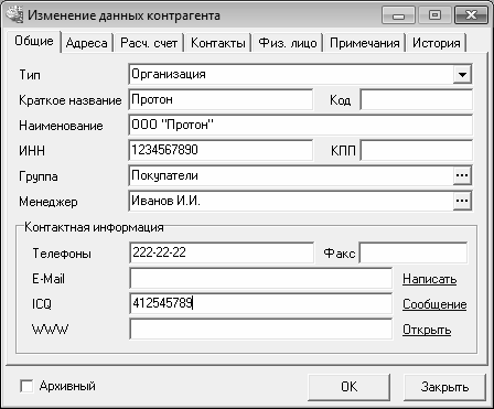 Завершается добавление контрагента в справочник нажатием в данном окне кнопки ОК. С помощью кнопки Закрыть осуществляется выход из данного режима без сохранения выполненных изменений. Эти кнопки доступны на всех вкладках окна.