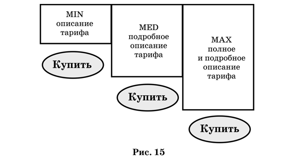Чтобы человеку было наиболее удобно сопоставлять информацию по всем вариантам тарифов, вам необходимо размещать их в виде пьедестала (рис. 15) или таблицы (табл. 5).