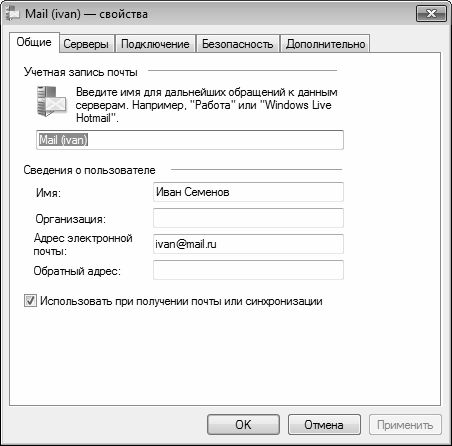 Как уже отмечалось ранее, вы можете в любой момент просмотреть и отредактировать параметры учетной записи. Для перехода в соответствующий режим щелкните на названии учетной записи правой кнопкой мыши и в открывшемся контекстном меню выберите команду Свойства. В результате на экране отобразится окно, которое показано на рис. 2.9.