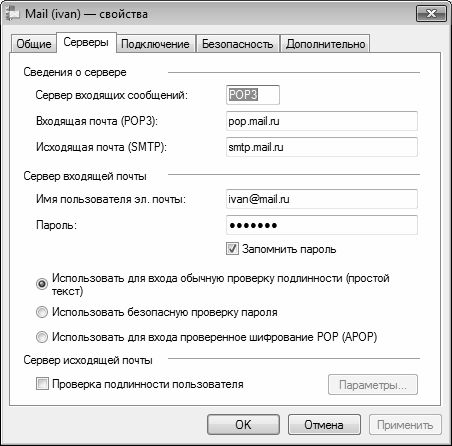 Рис. 2.10. Настройка параметров подключения к почтовому серверу