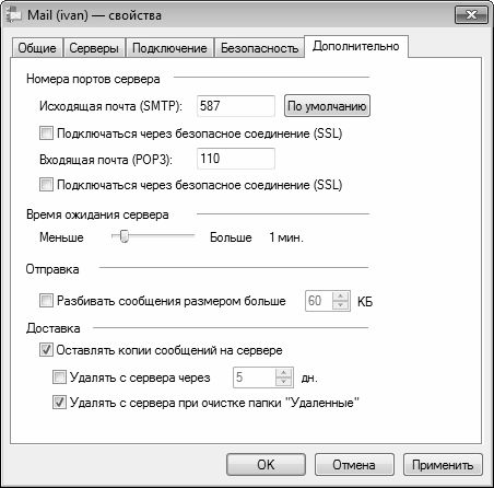 Принятые программой почтовые сообщения можно сохранить на сервере или удалить с сервера – требуемый режим выбирается с помощью соответствующих флажков. Если вы хотите, чтобы сообщения удалялись автоматически, моно указать интервал в днях, через который будет производиться удаление, или включить режим, при котором сообщения будут удаляться с сервера одновременно с очисткой в программе папки Удаленные.