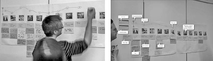 На этих фотографиях Дункан Браун из Caplin Group показывает то, что у них называется описательной картой маршрута. Видна «теперешняя» часть модели «до и после», с которой я начал эту книгу. На ней никак не отражается наше великолепное решение, а изображено лишь то, каким образом люди достигают своих целей сейчас – неудобства, неудачи и т. п.