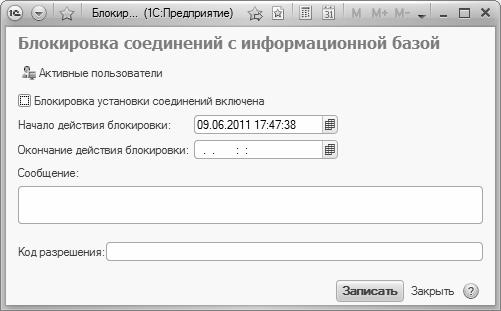 В программе реализована возможность наложения запрета на соединение пользователей с информационной базой. Это бывает необходимо, например, если для выполнения администраторских действий требуется прекратить работу всех пользователей в программе, а также в иных подобных ситуациях. При действующей блокировке новые пользователи также лишаются возможности подключиться к информационной базе.