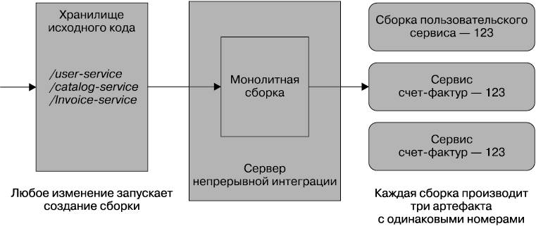 Рис. 6.1. Использование единого хранилища исходного кода и CI-сборки для всех микросервисов