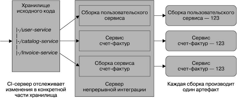 Рис. 6.3. Использование для каждого микросервиса одного хранилища и одной CI-сборки