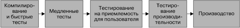 Чтобы полностью усвоить суть данной концепции, нужно промоделировать все процессы, вовлеченные в перевод программы из проверочного в производственное состояние, и знать, на какой стадии находится каждая заданная версия программы с точки зрения уверенности в ее готовности к выпуску. При применении CD это делается путем расширенного толкования идеи многоступенчатого конвейера сборки для моделирования каждой стадии, через которую должна пройти программа, как в ручном, так и в автоматическом режиме. Простой, возможно, уже знакомый вам конвейер показан на рис. 6.4.