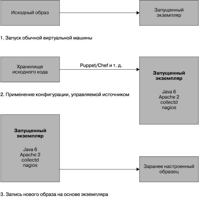 Как и в случае применения пакетов, характерных для конкретной операционной системы, эти VM-образы становятся отличным способом абстрагирования от различий в технологических стеках, используемых для создания сервисов. Разве нас волнует, что сервис, запущенный в образе, написан на Ruby или Java и использует gem-пакет или JAR-файл? Нам интересно только то, что все это работает. Тогда мы можем сконцентрировать усилия на автоматизации создания и развертывания этих образов. К тому же это становится отличным способом реализации другой концепции развертывания — неизменяемого сервера.