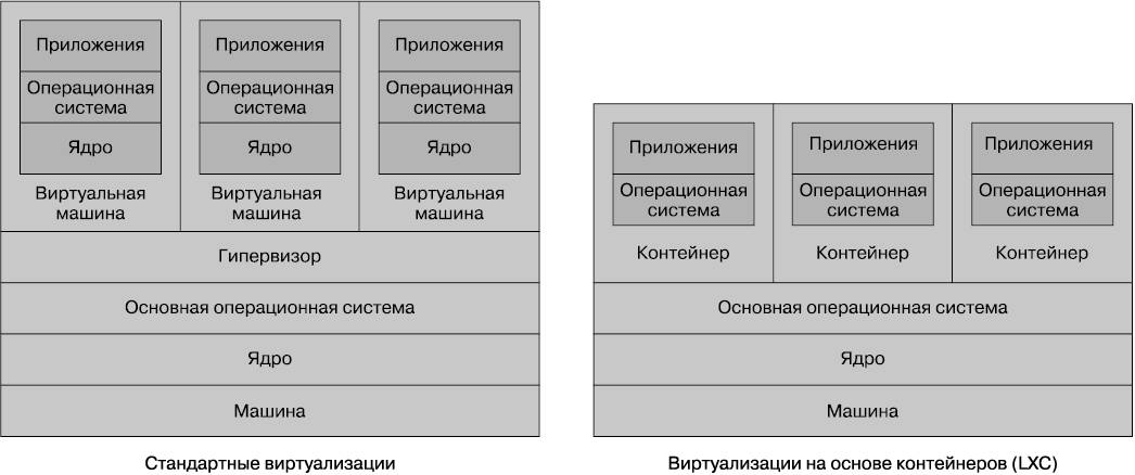 Рис. 6.9. Сравнение стандартной виртуализации второго типа и облегченных контейнеров