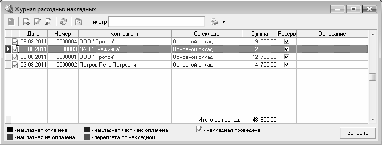 Для отображения позиций списка расходных накладных в программе может использоваться четыре цвета. Черным цветом отображаются полностью оплаченные документы, красным – полностью не оплаченные, синим – частично оплаченные, зеленым – накладные, по которым имеется переплата.