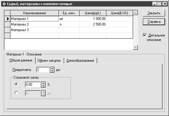 По каждому виду материалов (сырья, комплектующих) можно составить как упрощенное, так и детальное описание условий поставки. Чтобы включить режим детального описания (он будет применен ко всем позициям списка), установите флажок Детальное описание, который расположен справа от списка. При установленном данном флажке нижняя часть окна будет состоять из четырех вкладок: Общие данные, Объем закупок и Ценообразование. Если же флажок снят, то будет отображаться только одна вкладка – Общие данные.