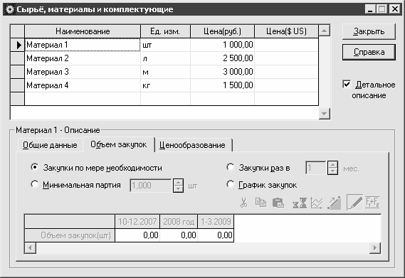 Вы можете ввести в программу график закупок каждого вида материалов (сырья, комплектующих) – это осуществляется на вкладке Объем закупок (рис. 4.59).