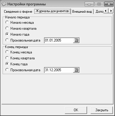 Как уже отмечалось выше, возможности программы предусматривают формирование журналов всех создаваемых в программе документов, а также общего журнала документов. Эти журналы включают в себя документы, созданные в определенном периоде времени, который указывается в настройках программы на вкладке Журналы документов (рис. 4.3).