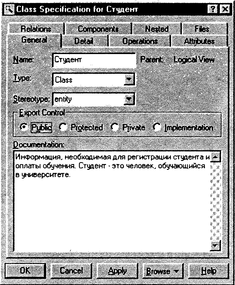 Параметры для класса студент показаны на рис. 4.5. Если язык, выбранный в модели по умолчанию, отличается от языка анализа (вкладка Notation (Нотация) диалогового окна Options (Настройки)), то в диалоговом окне параметров класса появится еще одна вкладка для языка.