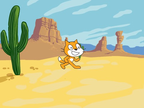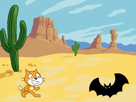 Давайте сделаем маленький мультик про Кота, который гулял по пустыне, повстречался с Летучей мышью, и улетел от неё на реактивном ранце. Летучая мышь заплачет горькими слезами. В этом проекте мы узнаем о том, как загрузить фон на стену, что такое костюмы персонажей, познакомимся с координатами Х и Y, а также научимся рисовать в графическом редакторе. Готовый проект будет выглядеть примерно так.