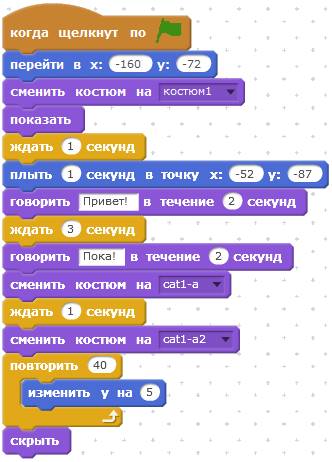 Запустите программу зелёным флажком. Убедитесь что всё работает правильно. Если Кот летает не так, как нужно, то проверьте значения координат Х и Y, а также убедитесь что в программе использован блок «изменить Y на 5», а не «установить Y в 5», эти блоки расположены рядом, многие часто их путают.