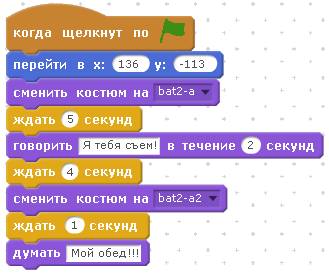 Запускайте программу. Если все сделано правильно, Кот подойдет к летучей мыши, скажет: «Привет!». Мышь скажет: «Я тебя съем!». Кот наденет реактивный ранец, улетит вверх и исчезнет. Мышь заплачет: «Мой обед!».