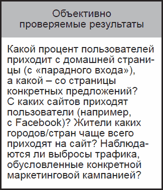 Задействуйте весь свой умственный потенциал и проследите за тем, чтобы ответы на эти вопросы существовали и были измеримы. Сколько трафика приходит на домашнюю страницу верхнего уровня из органического поиска по сравнению с приходами на страницы конкретных предложений из социальных сетей? Ответ на этот вопрос может быть выражен в числовой (измеримой) форме. Насколько заинтересовались пользователи, зашедшие на сайт? Ответ на этот вопрос объективного выражения не имеет.