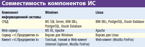 С появлением технологии Web-клиента можно говорить о полноценной поддержке Linux «1С: Предприятием 8» – все основные компоненты могут работать под управлением этой ОС. Более того, в конкретной информационной системе различные компоненты могут работать под управлением разных операционных систем. На выбор ОС для компонента будут влиять почти те же факторы, что и на выбор СУБД: лицензионная политика, принятая на предприятии, наличие специалистов по администрированию и поддержке и т. д. Важно, что и в этом случае технологическая платформа не загоняет предприятие в узкие рамки, а предоставляет возможность выбора.