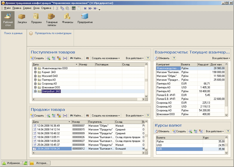 • Оконная система. Каждое окно «1С: Предприятия 8» в режиме управляемого приложения – независимо и представлено отдельном элементе на панели задач ОС (или же отдельное окно браузера при работе с Web-клиентом). Основное окно предназначено для навигации по функциям конфигурации и данным информационной базы, а вспомогательные окна используются для доступа к данным (например, через формирование отчетов) и модификации объектов информационной базы.