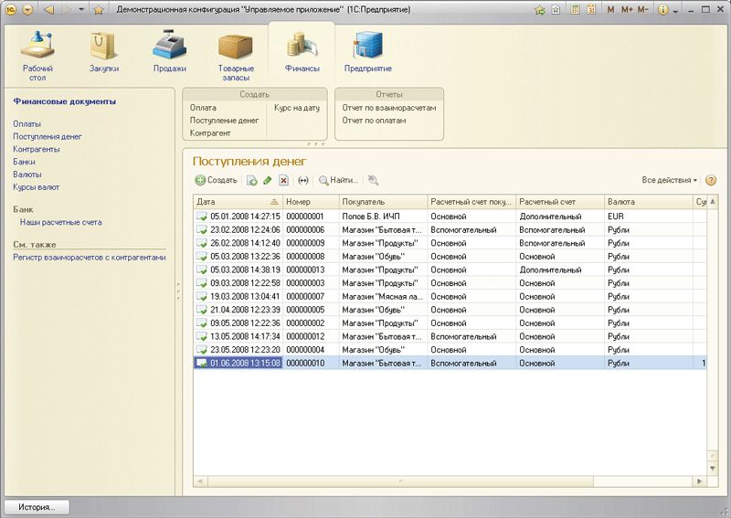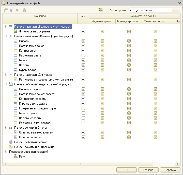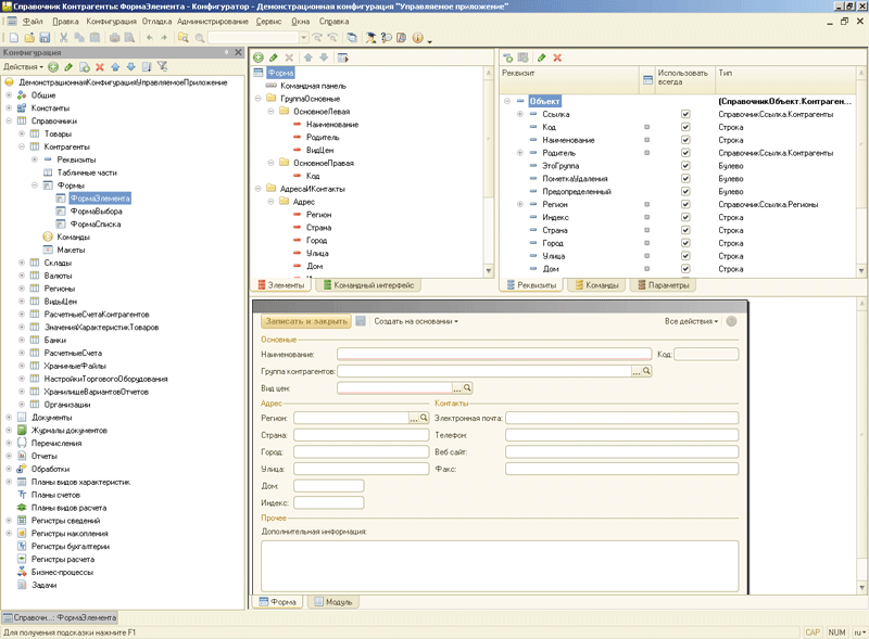 • Управляемый командный интерфейс. В режиме управляемого приложения «1С: Предприятие 8» формирует командный интерфейс прикладного решения на основании правил, описанных разработчиком. Структура разделов командного интерфейса и состав команд каждого раздела формируются платформой «на лету» (автоматически). При формировании командного интерфейса учитывается иерархия подсистем прикладного решения, права доступа пользователя, функциональные опции информационной базы, а также настройки порядка следования и видимости элементов, установленные разработчиком конфигурации по умолчанию и конкретным пользователем лично для себя.