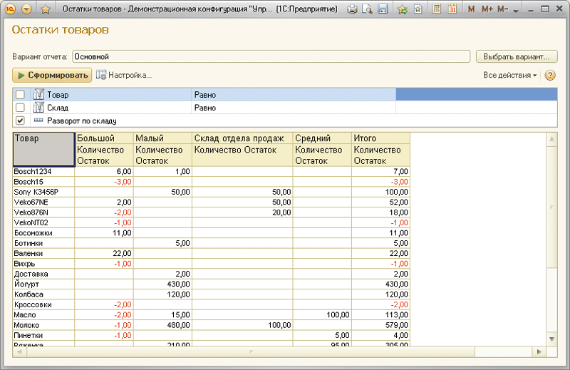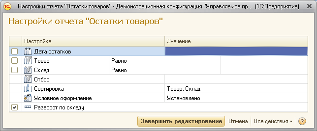 • пользователь выбирает один из существующих вариантов отчета и просто нажимает на кнопку «сформировать отчет». Если пользователю требуется что-то изменить в отчете, он оперирует теми настройками (как правило, несложными), доступ к которым ему предоставили разработчик конфигурации и специалист по внедрению.