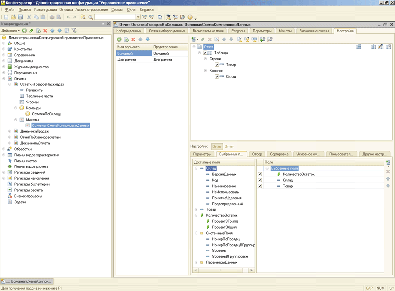 • разработчик прикладного решения создает схему компоновки данных и варианты отчета. Он также определяет, какие из настроек отчета будут доступны пользователю при работе с отчетом;