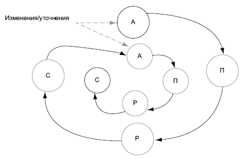 Что же не так в схеме? С увеличением сложности реализуемой системы анализ и следующее за ним проектирование начинают занимать всё больше времени. Постепенно обнаруживаются новые детали и подробности, изменяются требования к системе, возникают новые сопутствующие задачи, расширяющие периметр. Приходится, не отдавая проектную документацию в разработку, возвращаться к анализу. Возникает риск зацикливания процесса без конечного выхода какого-либо программного обеспечения вообще.