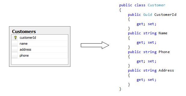 ORM — это аббревиатура от Object Relation Mapping или, по-русски, объектно-реляционная проекция. Очень легко объяснить сущность ORM: это механизм, который отображает на объекты объектно-ориентированного языка программирования сущности источника данных. Таким образом, одна запись таблицы Customers реляционной СУБД отображается в класс Customer в вашем коде (рис. 3.1).