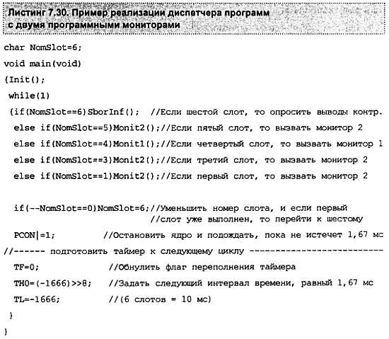 Теперь рассмотрим, как можно реализовать приведенные выше принципы организации программы на языке программирования С-51. Исходный текст программы приведен в листинге 7.30. Для нумерации слотов, на которые разбивается время, используется глобальная переменная NomSlot. Эта переменная используется как счетчик временных слотов. Именно по ее значению вызывается одна из подпрограмм-мониторов. Подпрограмма инициализации микроконтроллера такая же, как в примере, приведенном в листинге 7.27, и поэтому сейчас рассматриваться не будет.