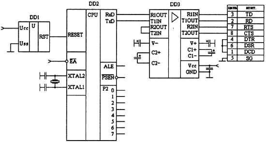 Наиболее ярким примером источника событий, наступающих в произвольный момент времени, является последовательный порт. Обычно через него принимаются или передаются многобайтные команды или пакеты данных. Рассмотрим пример обмена микроконтроллера с универсальным компьютером. Обычно для обмена используется последовательный порт компьютера (СОМ-порт). Схема согласования уровней сигналов последовательного порта микроконтроллера и СОМ-порта компьютера приведена на рис. 7.19.