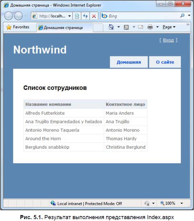 В результате представлению Index.aspx будет передана коллекция объектов типа Customer, которую требуется представить в виде таблицы. С использованием управляющего кода разметка представления может выглядеть так, как показано в листинге 5.6.