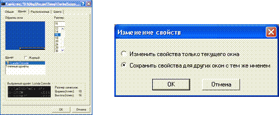 В появившемся окне выберите вкладку «Шрифт», а затем шрифт «Lucida Console» (рис. 179 слева). После нажатия кнопки ОК появится запрос, где можно подтвердить выбор шрифта для всех консольных окон (рис. 179 справа).