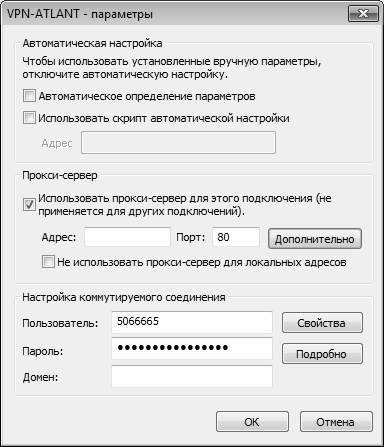 В окне Свойства обозревателя, открываемом с помощью команды главного меню Сервис ? Свойства обозревателя, следует перейти на вкладку Подключения, выделить на ней щелчком мыши используемое подключение и нажать кнопку Настройка. В результате на экране отобразится окно, которое показано на рис. 3.3.