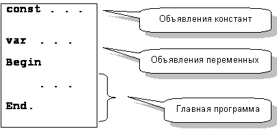 Теперь решим, где расположить это хозяйство? На рис. 41 показана знакомая вам структура простой программы. После объявления констант и переменных следует главная программа, где исполняемые операторы заключены между BEGIN и END.
