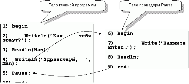 А вот и нет! Главная программа на то и главная, чтобы исполняться первой. Все начнётся с запроса имени пользователя и так далее. Когда же дело дойдет до вызова процедуры Pause, вступят в бой операторы в теле этой процедуры. Последовательность исполнения показана на рис. 42 (обратите внимание на нумерацию строк). Вызов процедуры Pause приведет, как говорят программисты, к передаче управления внутрь тела процедуры. После исполнения расположенных там операторов, управление возвращается в главную программу к оператору, следующему за вызовом.