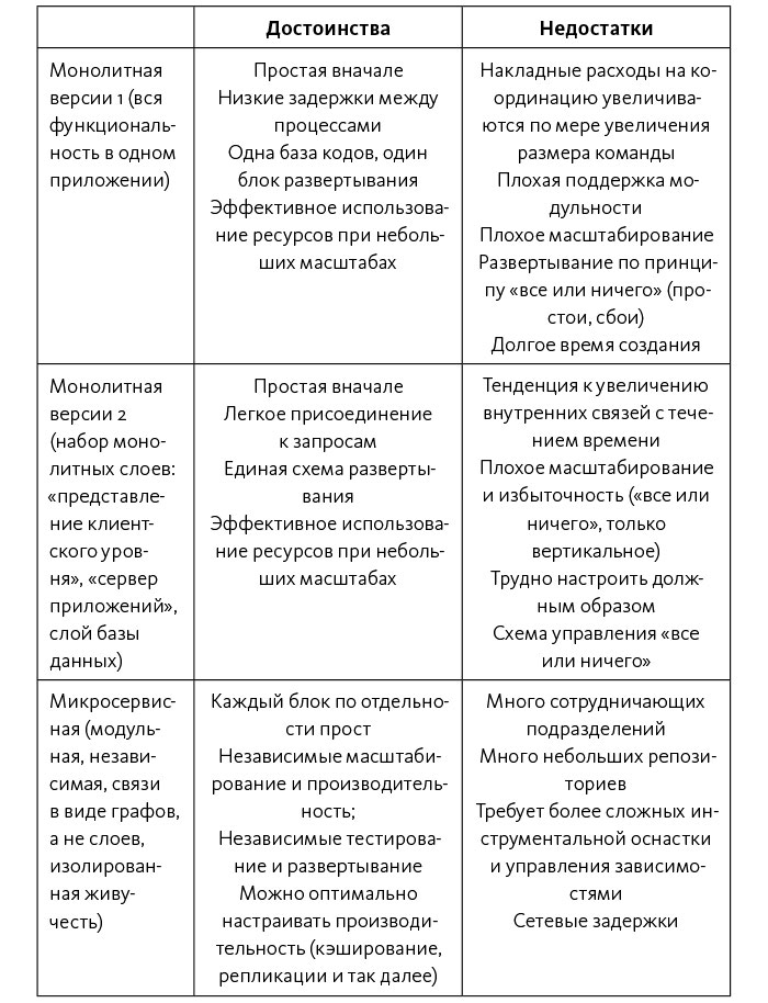 Основные архитектурные архетипы показаны в табл. 3, каждая строка означает различные эволюционные потребности организации, каждый столбец показывает достоинства и недостатки разных архетипов. Как видно из таблицы, монолитная архитектура, поддерживающая стартапы (например, быстрое прототипирование новых функций и возможность отклонений или больших изменений в первоначальных стратегиях), очень отличается от архитектуры, требующей наличия сотен команд разработчиков, когда каждая должна быть в состоянии самостоятельно предоставлять продукт клиентам. Поддерживая эволюционность архитектур, мы можем добиться того, что наша архитектура всегда обслуживает текущие потребности организации.