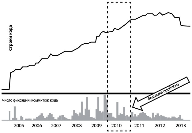 На рис. 24 верхний график показывает число строк кода в репозитории монолитной программы Blackboard Learn, нижний график показывает число фиксаций кода. Проблема, ставшая для Эшмана очевидной, заключалась в том, что количество фиксаций кода стало уменьшаться, объективно показывая нарастающую трудность внесения изменений в код, в то время как число строк кода продолжало увеличиваться. Эшман отмечал: «Эти графики свидетельствовали, что нам нужно что-то делать, в противном случае проблемы будут усугубляться, и этому не видно конца».