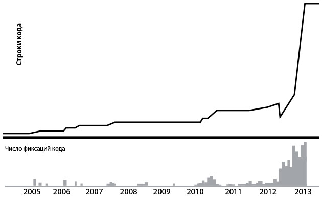 Как это начало влиять на производительность труда разработчиков, Эщман увидел на графиках, созданных на основе данных из репозитория исходного кода начиная с 2005 г.