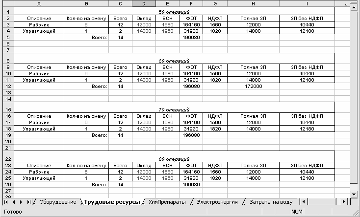 Как видно на рисунке, лист Трудовые ресурсы содержит несколько одинаковых таблиц. Это сделано для того, чтобы оценить работу проекта с разной степенью загрузки оборудования: 50, 60, 70 или 80 операций в день. При этом все данные в таблицах идентичны.