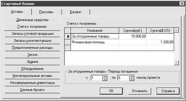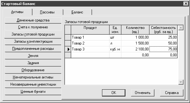 На этом ввод данных об начальных активах предприятия завершается. Для того чтобы сохранить введенную информацию, нажмите в данном окне кнопку ОК. При нажатии кнопки Отменить окно будет закрыто без сохранения изменений.